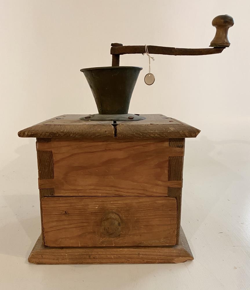 Kaffikvörn, sennilega úr furu. Gefin af Jóni Benediktssyni á Höfnum á Skaga.