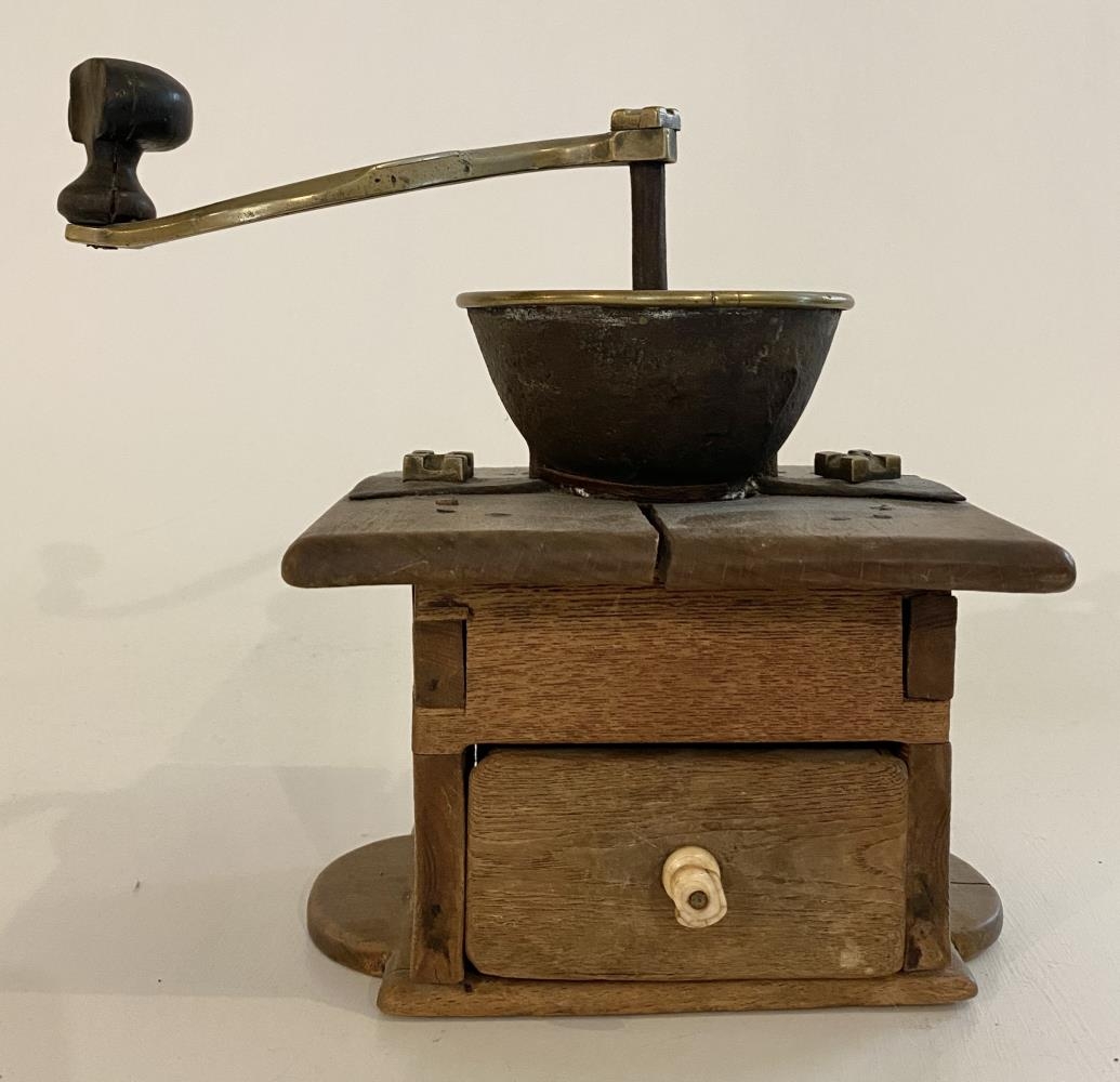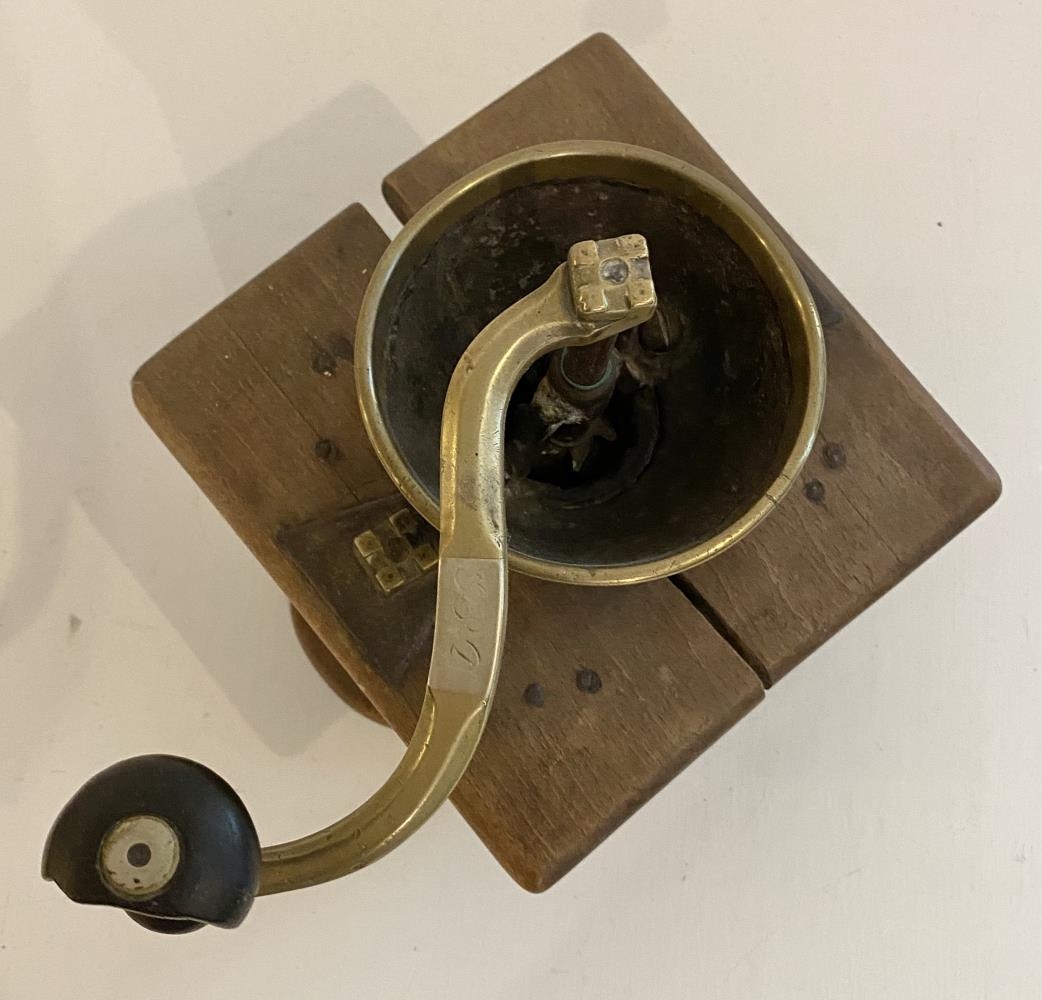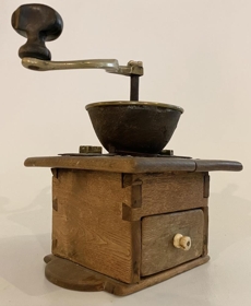 Gömul kaffikvörn úr harðviði, sennilega eik. Kassinn sjálfur er geirnegldur á hornunum. Botninn skagar út til beggja enda og eru hálfsporöskjur á endum hans. Á framhliðinni er skúffan og er framhlið hennar 10 x 5 cm. Hvílir skúffan ofan á botninum og er kringlótt, rennt beinhald framan á henni. Lokið er slétt plata 17 x 17 cm og skagar alls staðar út.