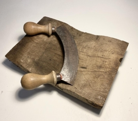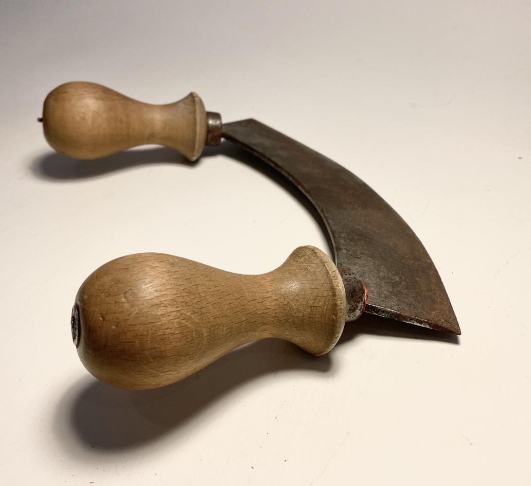 Tóbaksjárn með tréskafti. Járnið átti Ásgeir Búason frá Kollsá en hann skar tóbak fyrir verslanir eftir að hann fluttist til Reykjavíkur.