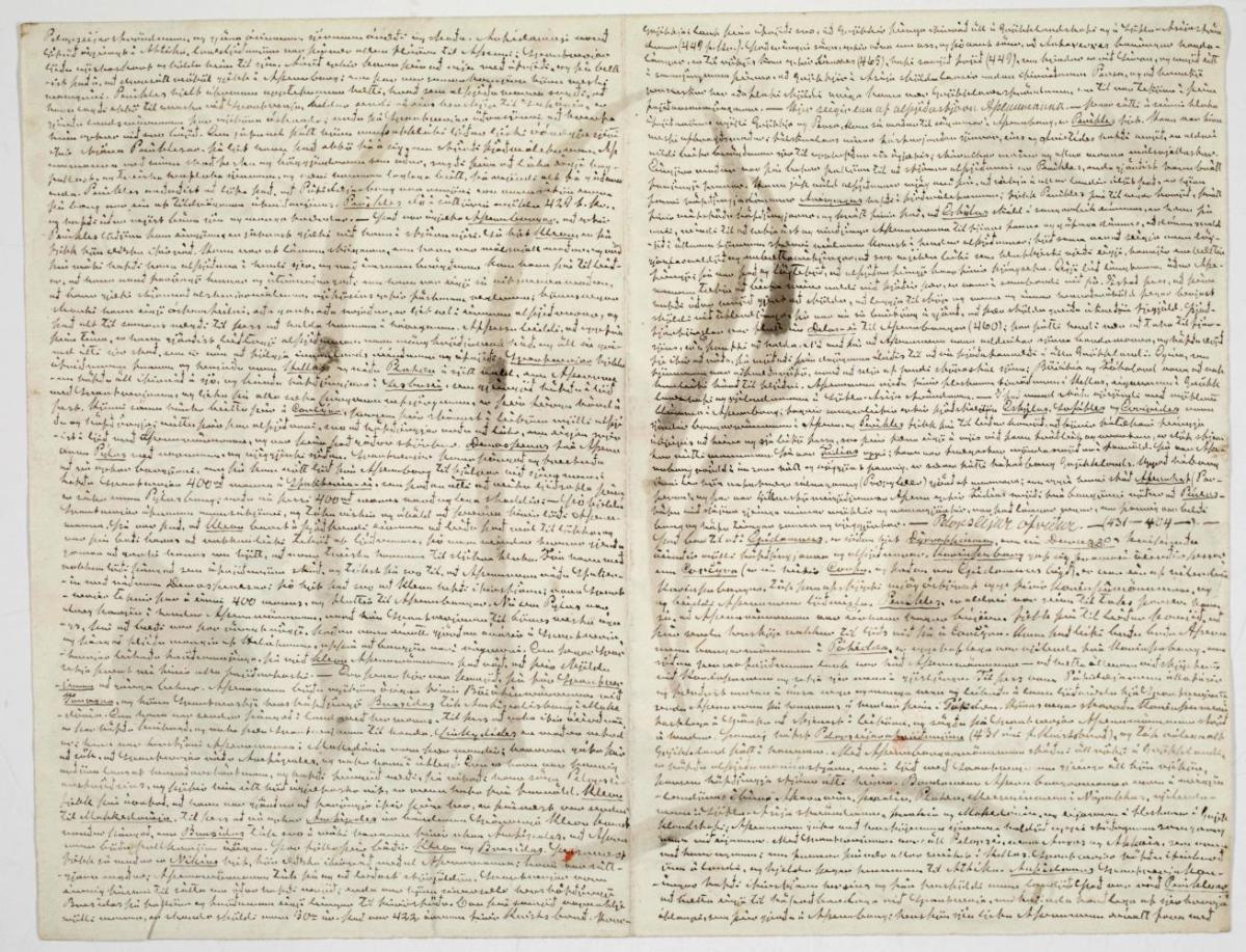 Teikningar og skrif Sölva Helgasonar umferðarmanns, f. 1820, d. 1895, munu frá árunum 1858-1888. Á blöðunum eru einkum skrautlegir upphafsstafir, fangamörk, blóm og mannamyndir. Sumar þeirra, af prúðbúnum yngismanni, eiga að vera af Sölva sjálfum og sum fangamörkin eru upphafsstafir ýmissa nafna erlendra heimspekinga, er hann gaf einnig sjálfum sér. Nokkrar stórkarlalegar myndir eiga að sýna Grím Jónsson amtmann í líki Kölska, en amtmaður reyndi að stemma stigu við flakki og lausingjahætti Sölva sem hataðist því við Grím. Sölvi skrifaði afar smágerva rithönd, þannig að erfitt er að lesa, á blöðunum eru meðal annars ferðasaga, stjörnufræði, fornaldarsaga og takmarkalaust hól um hann sjálfan og botnlausar skammir um aðra. - Komið frá Sighvati Grímssyni Borgfirðingi til safnsins. 8839 Teikningar og skrif Sölva Helgasonar, þekkts umferðarmanns sem haldinn var nokkurri geðveilu og mikilmennskukennd, f. 1820, d. 1895, munu frá árunum 1858-1888. Á blöðunum eru einkum skrautlegir upphafsstafir, fangamörk, blóm og mannamyndir. Sumar þeirra, af prúðbúnum yngismanni, eiga að sýna Sölva sjálfan og sum fangamörkin eru upphafsstafir ýmissa nafna, er hann gaf sér sjálfur. Nokkrar stórkarlalegar myndir eiga að sýna Grím Jónsson amtmann í líki Kölska, en amtmaður reyndi að stemma stigu við flakki og lausingjahætti Sölva og hataðist hann því við Grím. Sölvi skrifaði afar smágerva rithönd, þannig að erfitt er að lesa. Á blöðunum eru meðal annars ferðasaga, stjörnufræði, fornaldarsaga og takmarkalaust hól um hann sjálfan og botnlausar skammir um aðra. 8839 Spjaldtexti: Sólon Islandus Sölvi Helgason, 1820–1895, átti sjaldan fast heimili en flakkaði víða um. Hann var kenndur við hrekki og óráðvendni og var um tíma í fangelsi í Kaupmannahöfn. Sölvi var orðlagður fyrir sjálfhælni og þóttist bera skyn á flesta hluti. Í honum leyndust ýmsar gáfur og listhneigð en allt brenglaðist það í veikluðu geðslagi. Eftir Sölva eru til margar teikningar og skrif. Teikningar hans eru í mörgum litum, mest blómaflúr og upphafsstafir, þar á meðal fangamörk fólks sem hafði gert honum gott og hann gaf myndir að launum. Þá eru í myndum hans upphöf nafna heimspekinga úr veraldarsögunni, sem hann tók sér jafnframt sjálfur og kallaði sig meðal annars Sólon Islandus. Myndirnar eru sumar af yngismönnum sem eiga að sýna hann sjálfan en einnig eru myndir af óvinum hans í líki kölska. Nokkrar þeirra eru af Grími amtmanni Jónssyni en Sölvi hataðist við hann því að Grímur vildi stemma stigu við flakki hans og lausingjahætti. Skrif Sölva eru af ýmsu tagi. Sem dæmi má nefna Frakklandssögu, ferðasögur, stjörnufræði, fornaldarsögu, hólgreinar um hann sjálfan og skammir um þá sem honum voru ekki að skapi. Fjögur spjöld með myndum eftir Sölva Helgason. Sólon Islandus Sölvi Helgason (1820–1895 AD) rarely had a home to call his own, and lived a vagabond life. He had a reputation for pranks and dishonesty, and he spent time in jail in Copenhagen. Sölvi was known for his high opinion of himself, and he saw himself as an expert on almost everything. He was artistic and a man of many talents but everything he did was affected by his mental illness. Sölvi left many drawings and writings. His drawings are colourful, mostly floral patterns and initials, including the initials of people who had been good to him, whom he repaid with pictures. His pictures also include elements of names of famous philosophers, and he adopted such names himself. One of the names he used was Sólon Islandus. Some of his pictures are of young men, intended as self portraits, while he also drew images of his enemies as devils. Some of the pictures are of Deputy Governor Grímur Jónsson. Sölvi hated the deputy governor for trying to put a stop to his vagabond ways. Sölvi left writings on a variety of subjects, including a History of France, travel stories, astronomy, ancient history, articles in praise of himself, and attacks on people who had offended him. Four Posters with pictures by Sölvi Helgason.