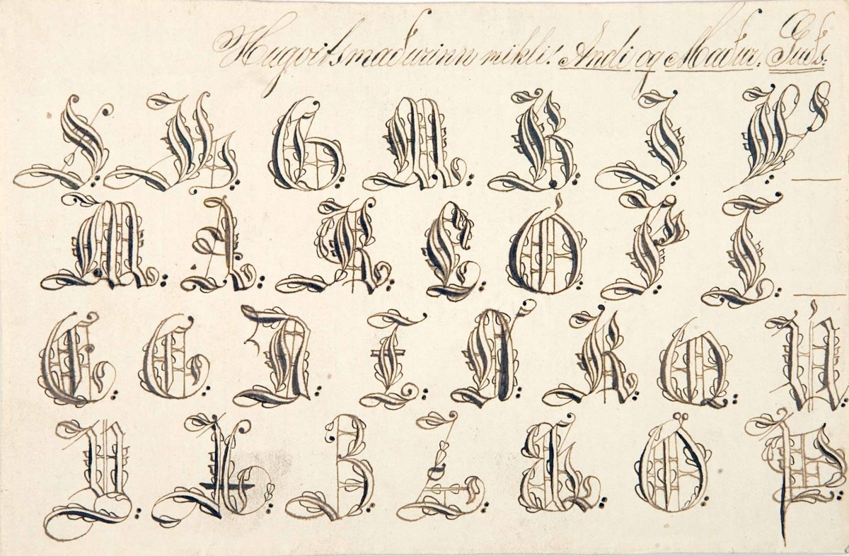Teikning eftir Sölva Helgason (Sólon Islandus) af upphafsstöfum, skrautrituðum, með svörtu bleki á hvítan pappír. Efst stendur: Hugvitsmaðurinn mikli! Andi og Maður. Guðs. Þar fyrir neðan koma fjórar línur af skrautteiknuðum stöfum, sem að líkindum eiga að standa fyrir nöfn Sölva. Stafirnir virðast geta verið eitthvað á þessa leið: S.H.G.M.B.J.W. M.A.K.L.Ó.P.I. E.G.A.I.N.K.Q.Ú. Y.H.B.Z.H.O.P.