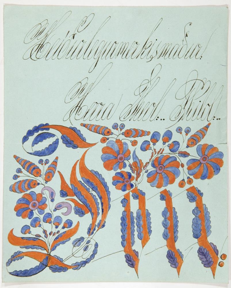 Lituð teikning eftir Sölva Helgason (Sólon Islandus) af nafndrætti: Jón, blómskreyttum, teiknuðum á blátt blað með svörtu bleki. Fyllt er í stafina með rauðum og bláum litum. Fyrir ofan nafnið stendur, með svörtu bleki: Heiðurlegurmerkismaður: Herra Sheol:.. Philol:..