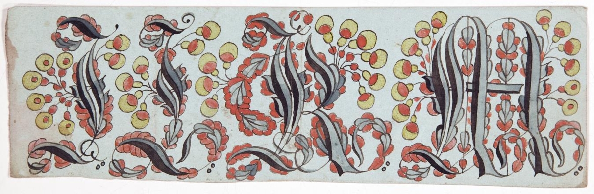 Lituð teikning eftir Sölva Helgason (Sólon Islandus), af blómskreyttum upphafsstöfum: I. L. K. M. í svörtum, grágrænum, rauðum og gulum litum, gerð á bláan pappír.