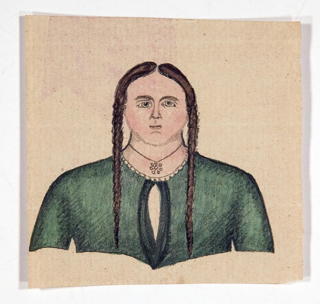 Lituð blýantsteikning eftir Sölva Helgason (Sólon Islandus) af konu á grænni treyju eða peysu. Konan er með sítt, dökkt hár í tveimur fléttum. Hún er með hálsmen með hringjum sem mynda einskonar blóm. Myndin er mjög svipuð þeim þremur sem eru nr. 8839-26 og 8839-30.