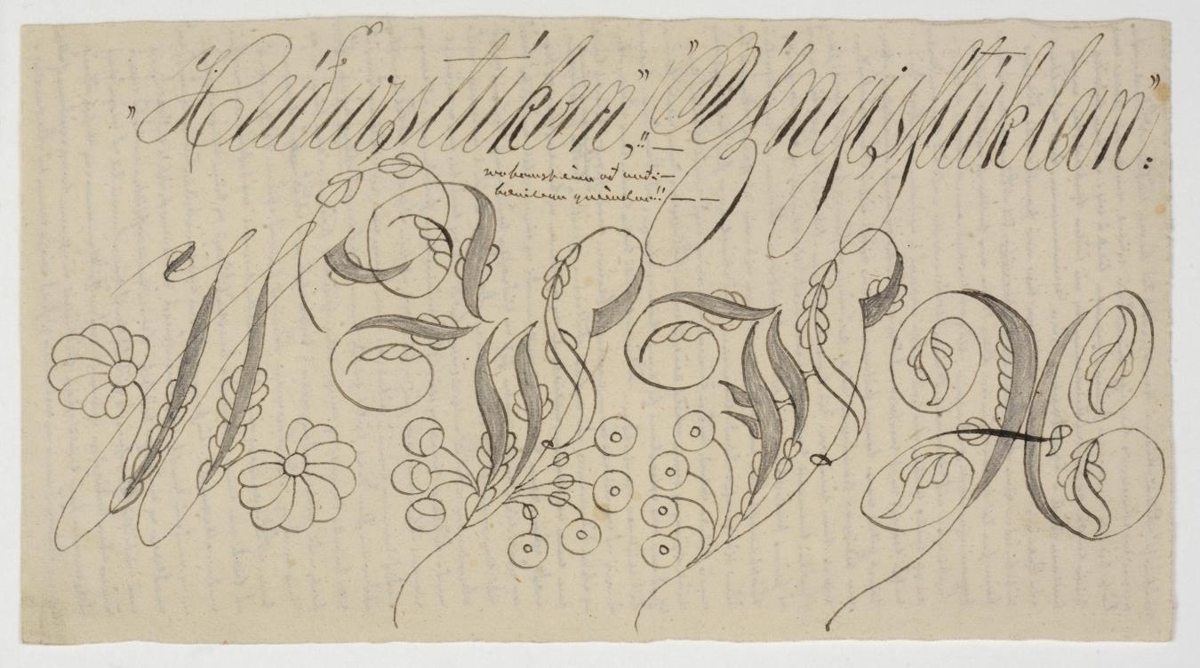 Teikning eftir Sölva Helgason (Sólon Islandus), af blómskreyttum upphafsstöfum: [?] V V H (óljóst hver fyrsti stafurinn er), gerð með svörtu bleki á hvítan pappír og auk þess eilítið fyllt inn í stafina með blýanti. Ofan við fangamarkið stendur: "Heiðurstúkan", "Ýngisstúklan": (ath. stafsetning er Sölva). Þar fyrir neðan er smáskrift sem er eitthvað á þessa leið: svo komst einn að orði- [...] greindur!!_ _.