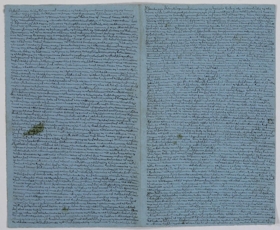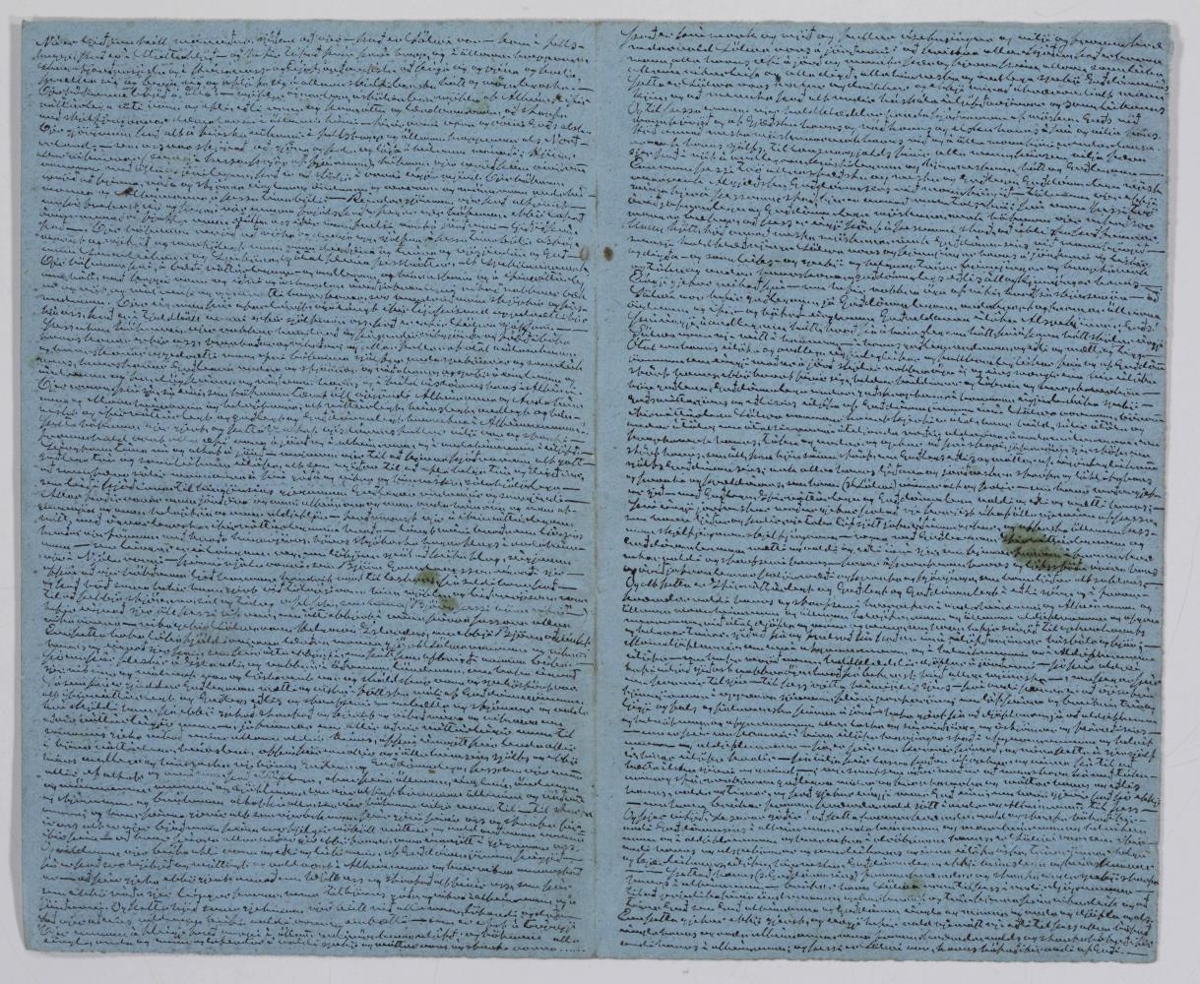 Blátt blað (opna úr bók) þakið smáskrift eftir Sölva Helgason (Sólon Islandus), beggja vegna. Skrifað með svörtu bleki. Skriftin er sérlega smágerð. Á annarri hliðinni hefst textinn svo: Nú er liðinn réttt mánuður sýðann að vier – það er Sölwi vor – kom í fulls-…