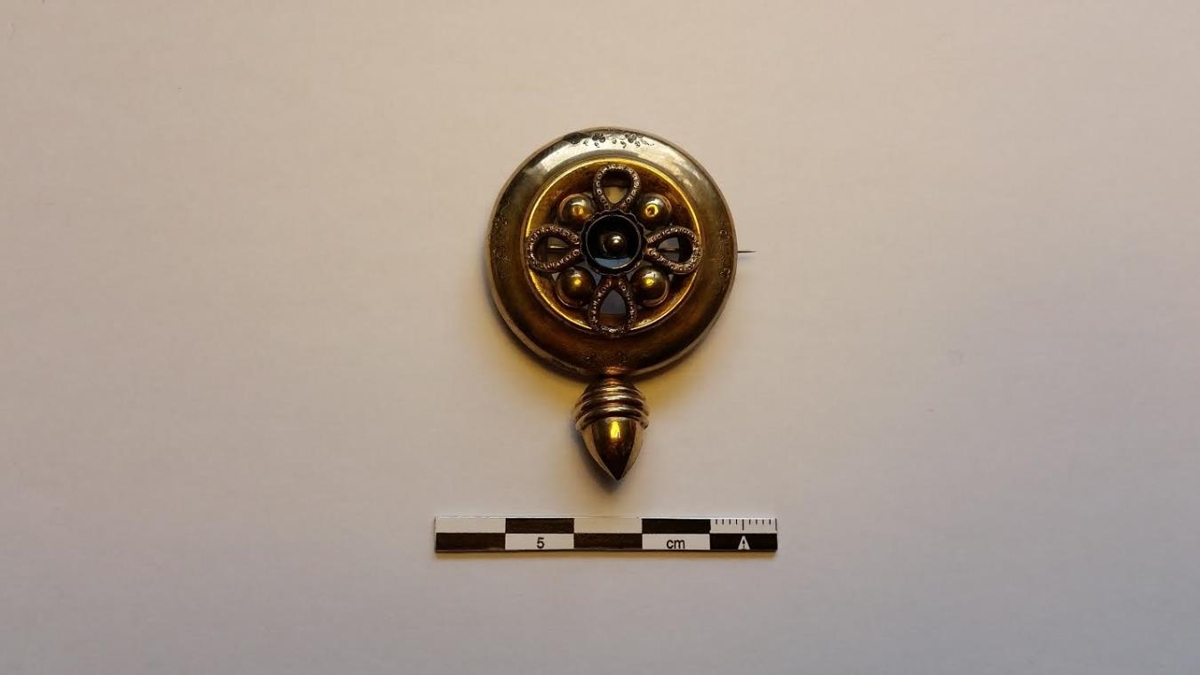 Hringlaga og kúpt næla með þrykktu fjögurra blaða víravirkislíki. Í miðri nælunni er svört glertala / skífa, íbjúg. Neðan úr nælunni hangir skraut sem líkist akarni. Aftan á nælunni er festiprjónn og festing.