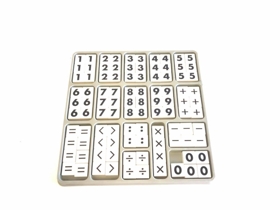 2 kassar með plastkubbum með bókstöfum og tölustöfum. Kubbarnir eru í gráum plastbökkum með hólfum fyrir hverja stafatýpu. Annar bakkinn er með bókstöfum, oftast 4-6 saman í hólfi og álíka margar gerðir af hverjum staf í hólfinu. í hinum bakkanum eru tölustafir og ýmist greinarmerki. Bakkarnir eru í pappabökkum.