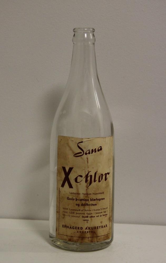 Glær glerflaska. Texti á álímdum miða: Sana - Xchlor - Inniheldur Hypochlor - Gerir þvottinn blæfagran og drifhvítan. Notið matskeið af Xchlor í hverja 5 lítra af vatni. Látið þvottinn liggja í legi í 10-15 mínútur. Skolið síðan úr hreinu vatni.