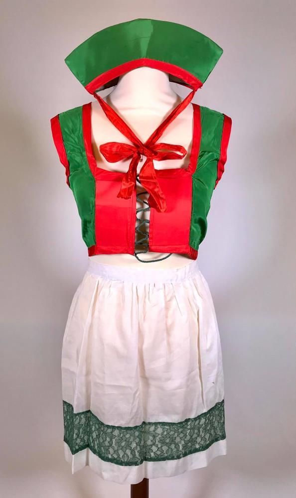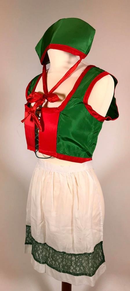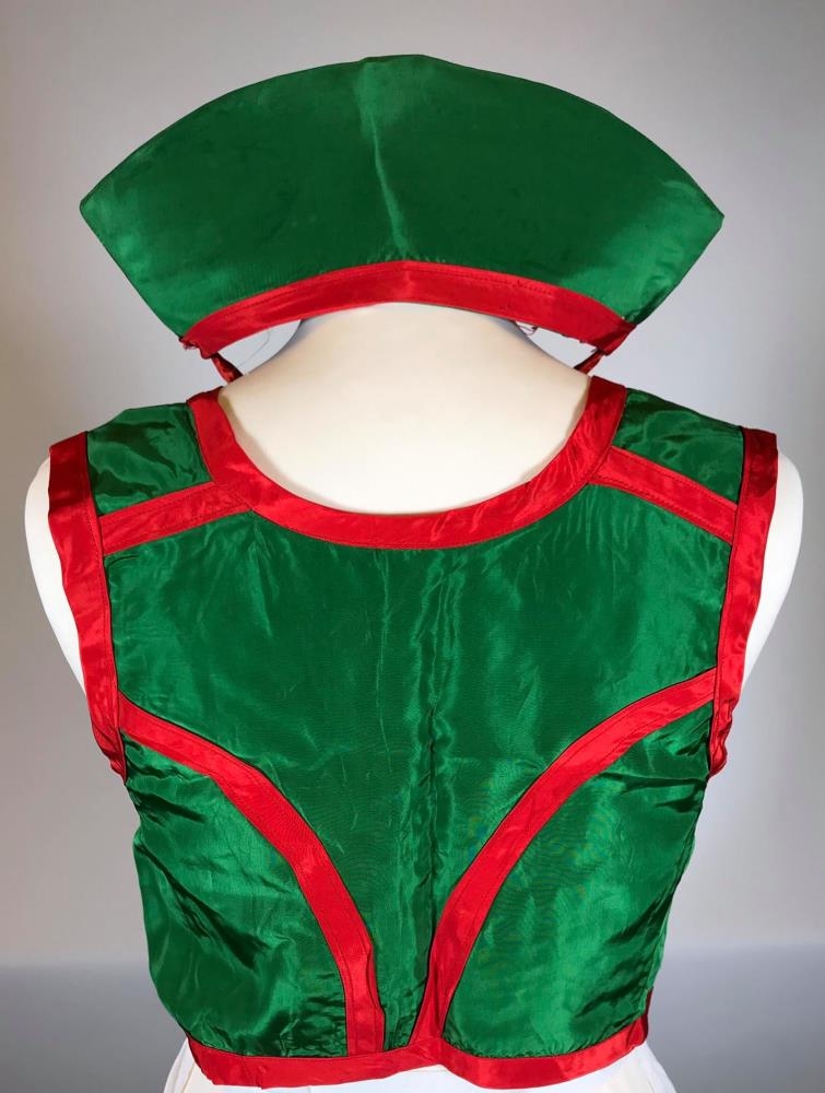 Öskudagsbúningur: Vesti og höfuðfat úr grænu efni með rauðum köntum og skrauti. Hvít svunta með grænum munsturbekk að neðan.