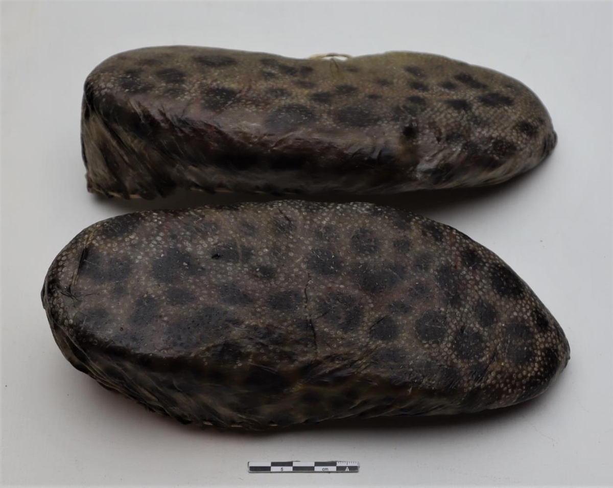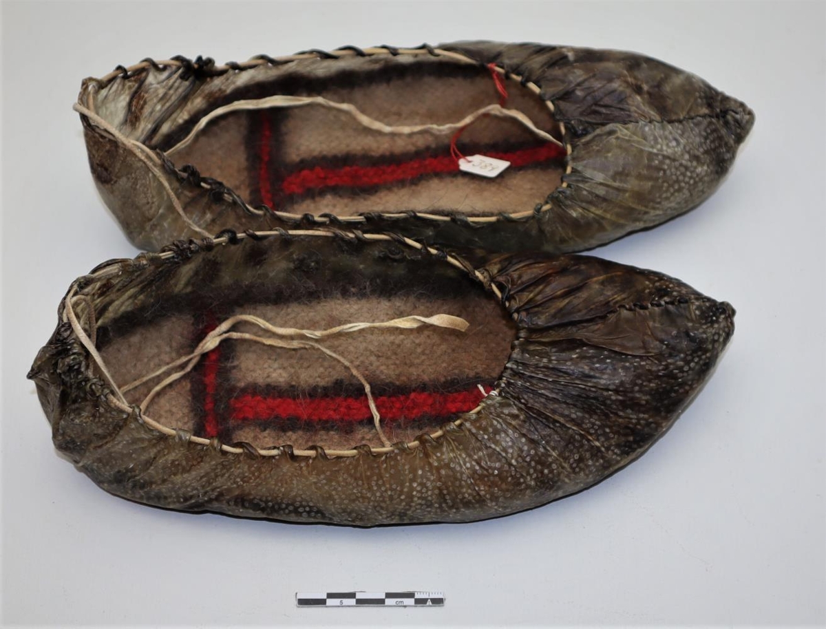 Roðskór af hlýra, 25 cm langir. Þeir eru óvenju vandaðir af roðskóm að vera. Eru þeir dregnir í gegn með skinnþræði og reimaðir að aftan. Voru slíkir skór yfirleitt óvandaðir, þar sem þeir entust illa. Skórnir eru gerðir af Jóhönnu Kristjánsdóttur Kirkjubóli Bjarnadal Önundarfirði. Hlýrinn var roðflettur af Guðmundi Inga Kristjánssyni bróður hennar. Guðmundur Jósafatsson frá Brandsstöðum gaf safninu þá 24.júní 1971. Þeim fylgja illeppar brúnir að lit, með dökkbrúnum köntum og rauðu munstri.