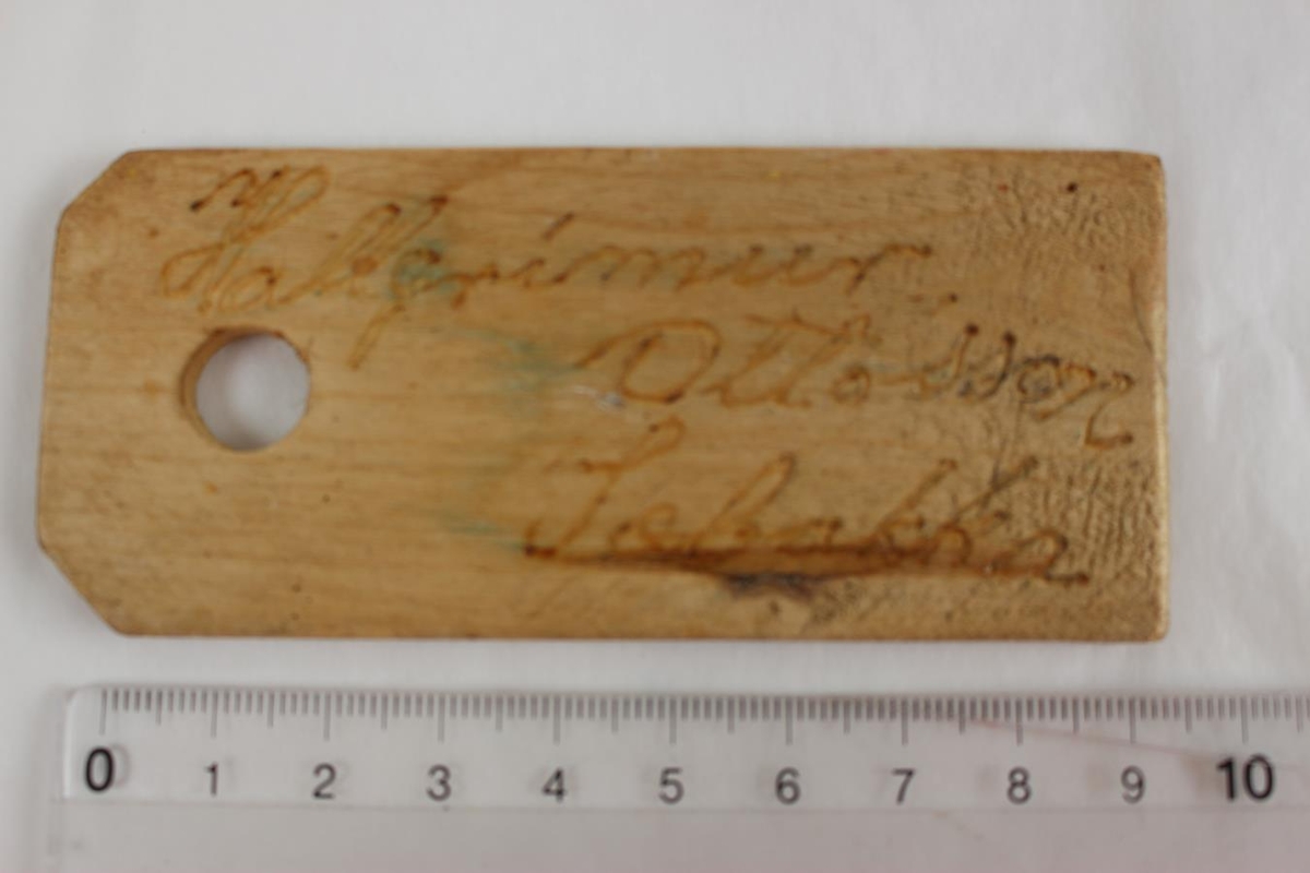 Nafnspjaldaplata úr við, skorið í hana er Hallgrímur Ottósson Sæbakka.