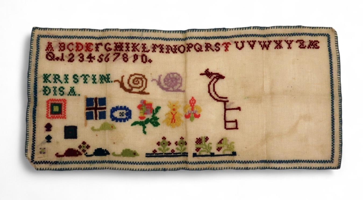 Stór og gamall prufuklútur/stafaklútur. Klúturinn er allur handsaumaður. Kristín saumaði hann í Austurbæjarskóla eða Gagnfræðaskóla Austurbæjar uppúr 1930. Klúturinn er saumaður í fíngerðan stramma og allur útsaumur er saumaður með krosssaumi. Saumað er stafrófið, tölustafirnir frá 0 – 9, nafnið Kristín, og Disa (sem var systir Kristínar) og ýmis smámunstur. Dæmi um munstur: Íslenski fáninn, sniglar, blóm og mýs. Utan um klútinn er saumaður mjór krosssaumsbekkur og tunguspor (kappmelluspor) utan um kantinn. Það hafa verið notaðir ýmsir garnspottar í útsauminn. Það má sjá nokkra bláa liti í krosssaumsbekknum sem er utan um klútinn og í stafrófinu eru einnig nokkrir rauðir litir. Klúturinn er ekki fullkláraður. Stærð 56 x 25 sm.