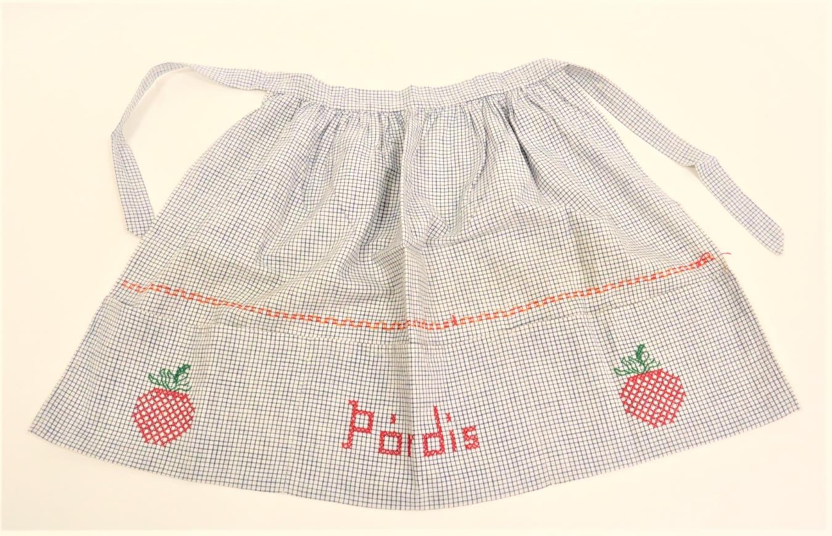 Svunta saumuð í 5.bekk í Langholtsskóla veturinn 1965-1966. Brotið er upp á svuntuna að neðan til að mynda vasa og síðan er brotið hólfað niður í þrjá vasa. Útsaumur á vösum: Krosssaumur og afturstingur. Nafnið ÞÓRDÍS er saumað í miðjuvasann og jarðaberjamunstur á vasana sitt hvoru megin. Mjór munsturbekkur saumaður á svuntuna fyrir ofan vasana. Útsaumsspor: Ídregið tvöfalt þræðispor. Svuntan er rykkt undir strenginn. Mittisstrengur og bönd eru í einu lagi. Böndin eru saumuð tvöföld. Strengurinn er saumaður niður í höndum á röngunni. Svuntuna saumaði Þórdís Zoega, (kt. 030155-3789) systir Helgu.