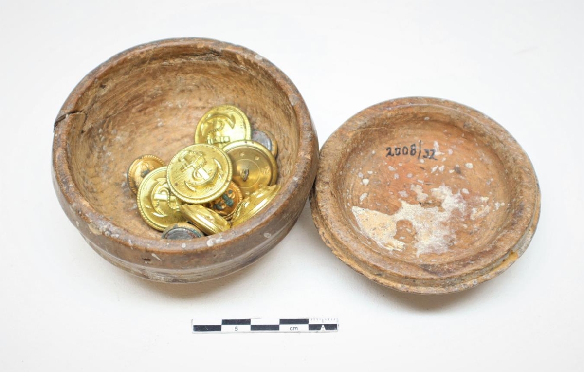 Í henni eru 12 hnappar, gylltir með akkerismynstri. Í öskjunni eru líka