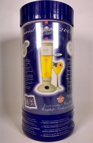 Kokteilblandari fyrir árþúsundapartý 2000. Í upprunalegum umbúðum, vel með farið og ónotað. Umbúðir hár sívalningur úr plasti. Blár botn og lok en glært plast í miðju þannig að innihald sést.