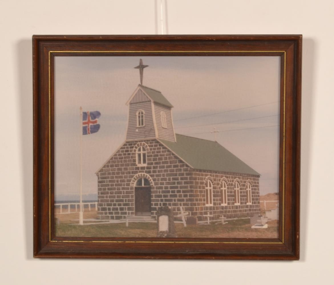 Stækkuð litljósmynd í brúnum og gylltum viðarramma. Myndin er af Innri-Njarðvíkurkirkju. Á myndinni, sem er án ártals, er kirkjan með turninum sem settur var á hana 1944 og með ljósakrossi sem settur var á turninn 1965. Þetta var hvorutveggja fjarlægt af kirkjunni þegar hún var færð í upprunalega mynd að utan 1981 til 1986.