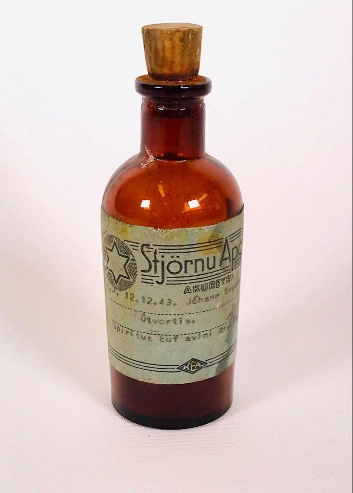 Lítil brún flaska með korktappa. Blár límmiði, ferkantaður, stór miðað við flöskuna. Áletrun : Stjörnu Apótek. Akureyri. KEA. útvortis. Spiritus euf ... ólæsilegir prentstafir. Mynd af stjörnu á bláum grunni.