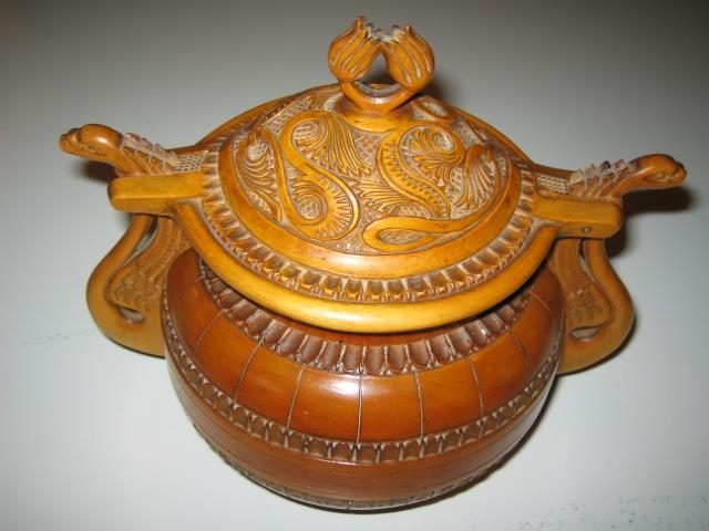 Útskorinn tréaskur, til skrauts. Brúðkaupsgjöf til Sigurbjargar Lúðvíksdóttur og Jóns Sigurðssonar frá Maríu og Ríkarði.