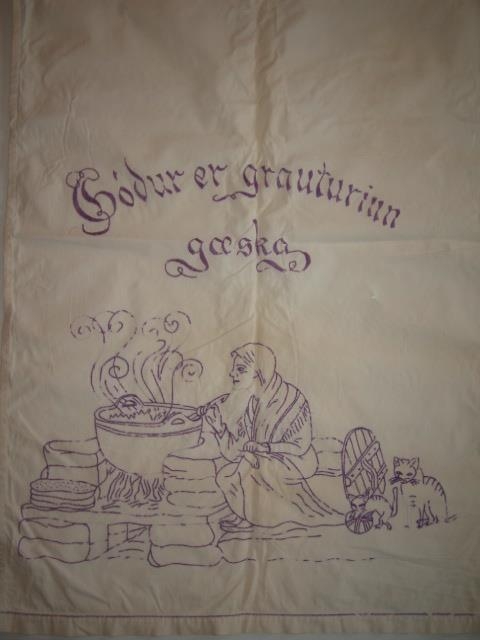 Puntuhandklæði, hvítt með fjólubláum ísaumi. Mynd af konu sem situr við stóran pott og hrærir í. Köttur og kettlingur sitja við hlið eldstæðisins. Yfir myndinni stendur "Góður er grauturinn gæska". Handklæðið er lítið eitt rifið hér og þar.