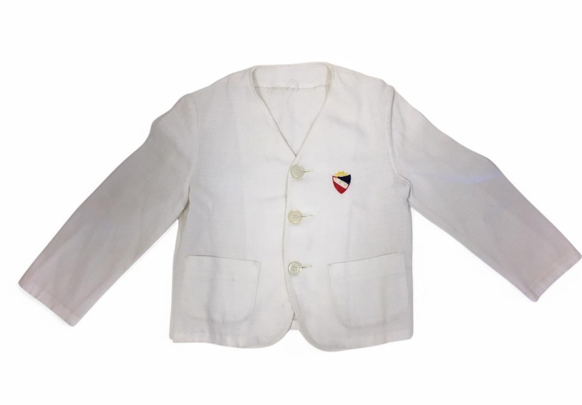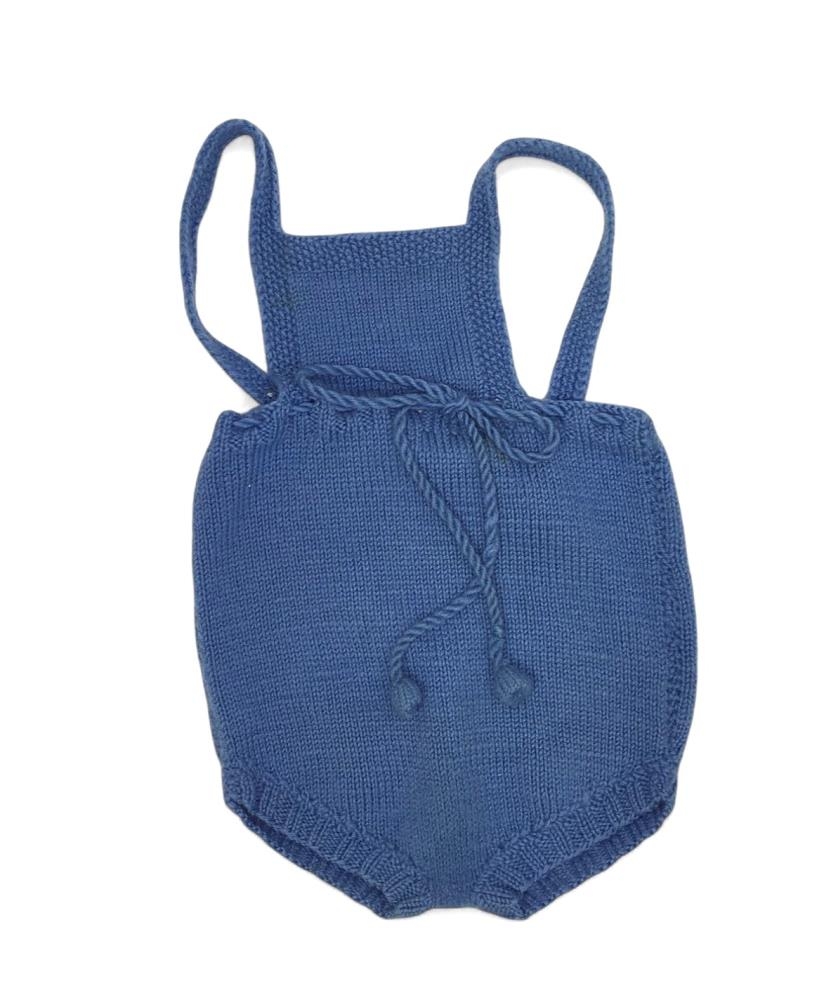 Jakki, hvítur, og prjónaðar smekkbuxur, bleiubuxur, bláar, á lítið barn. Heimagert.