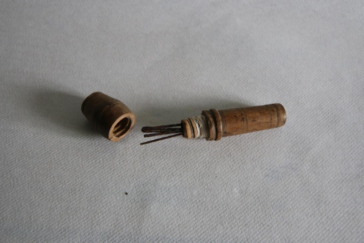 Nálhús úr renndum viði. Átti Guðfinna Valgerður Helgadóttir, húsfreyja í Ytri-Hlíð, móðir gefanda.