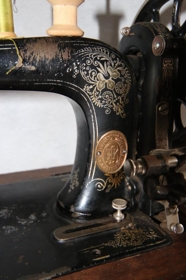 Svört saumavél með blómaflúri framleidd af Bergmann & Hüttemeier, Kaupmannahöfn. Úr eigu Guðfinnu Þorsteinsdóttur, skáldkonunnar Erlu, Teigi.