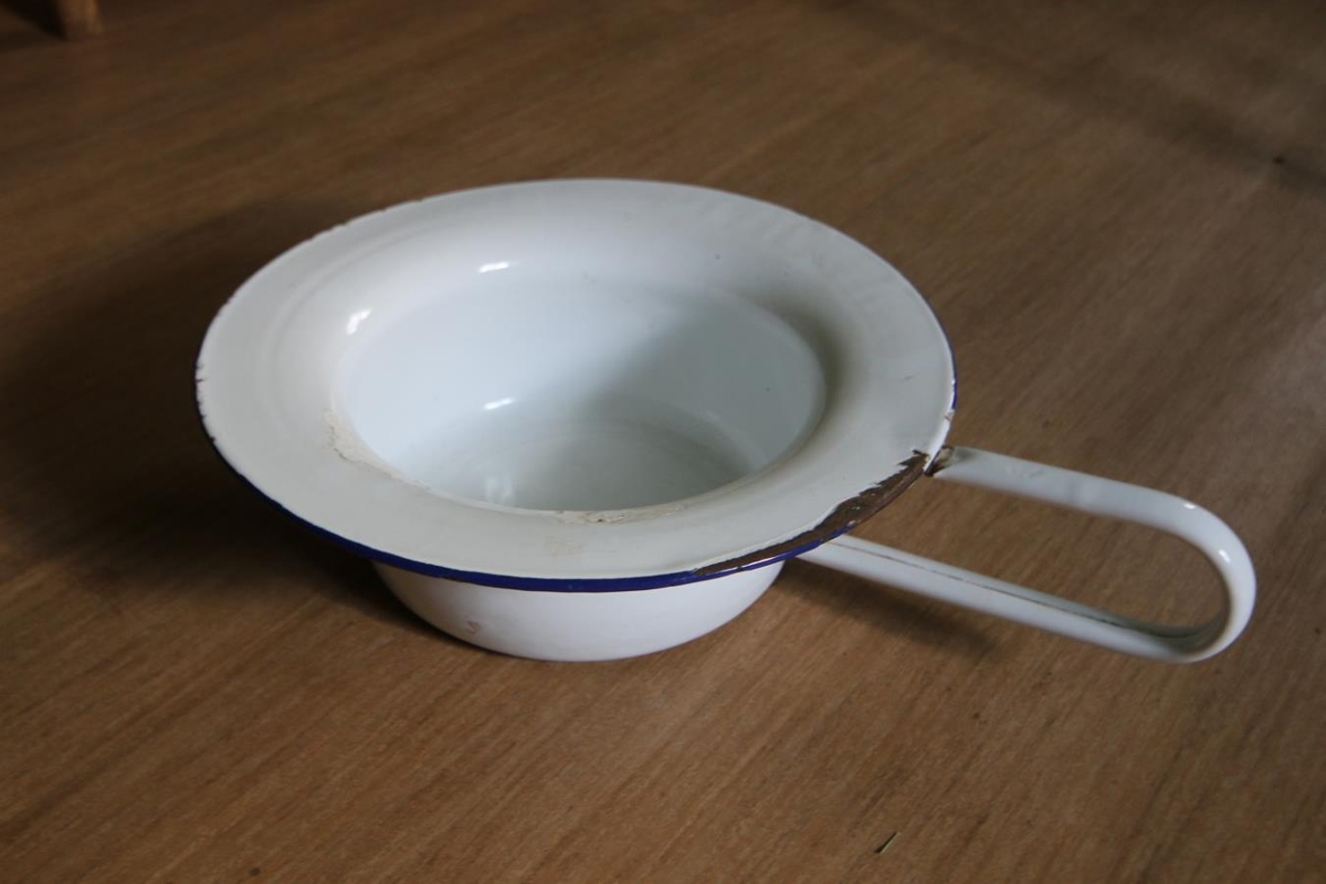 Bekken. Hvítt með blárri rönd. Fylgdi munum sem Hildigunnur Valdimarsdóttir, Teigi, gaf safninu. Gæti verið ættað þaðan, en einnig er hugsanlegt að það sé frá Hraunfelli eða Þorbrandsstöðum.