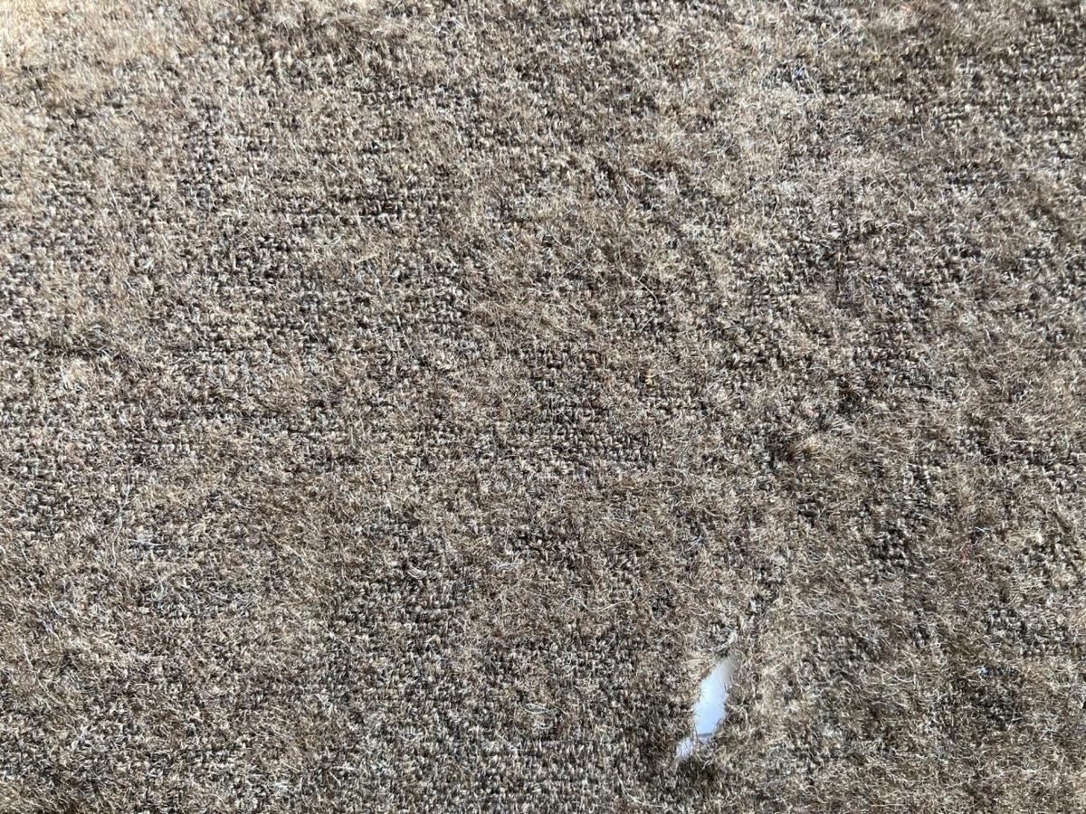 Sýnishorn af vaðmáli, sauðalitir, brún. Er úr slitnu fati. Um 47 x 30 cm. Afhent af Þórði Tómassyni. Fengið hjá Hallgrími Axelssyni í Þjóðólfshaga 1991 en óskráð.