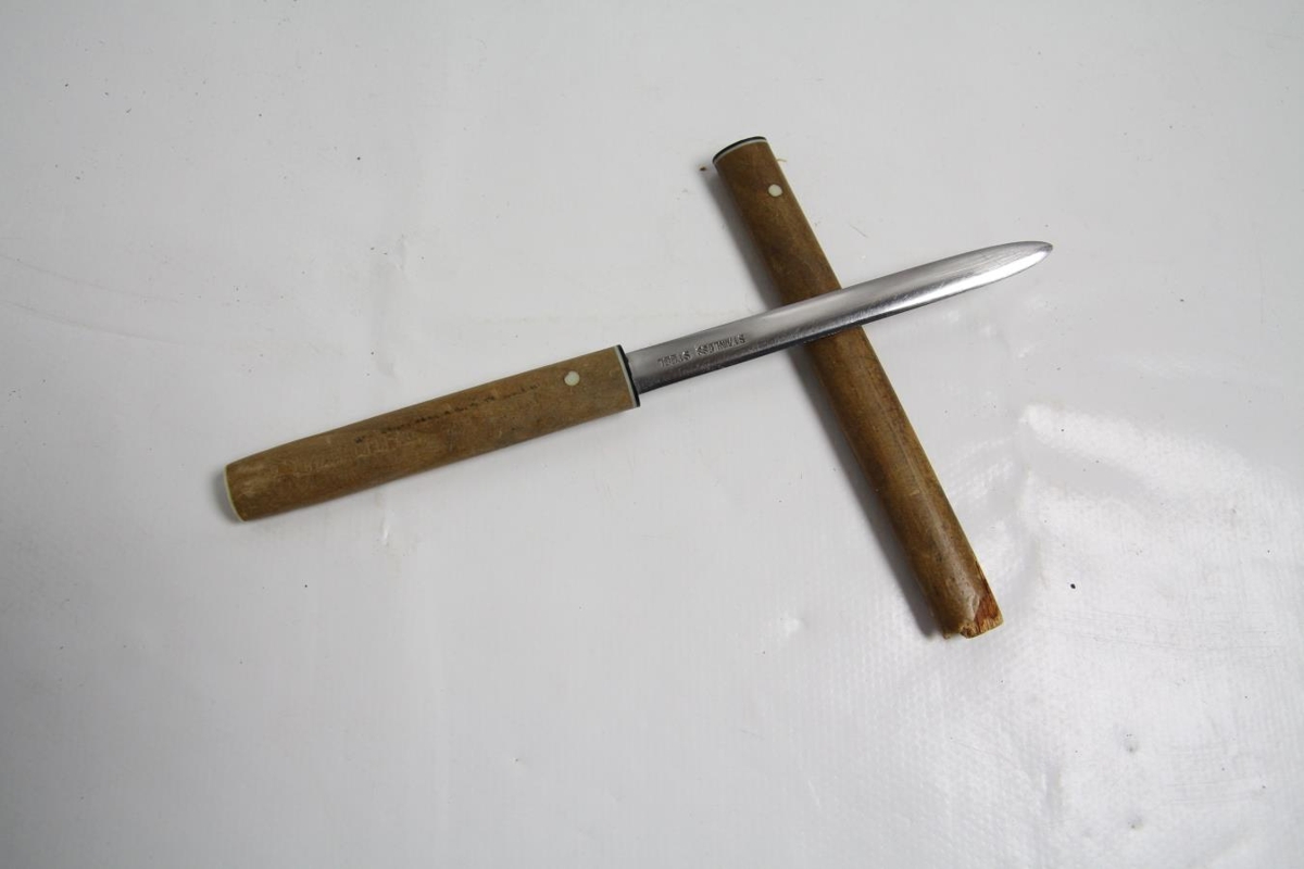 Bréfhnífur í eigu Svavars Guðnasonar listmálara. Hnífurin er úr ryðfríu stáli með viðarskafti og hulstri.