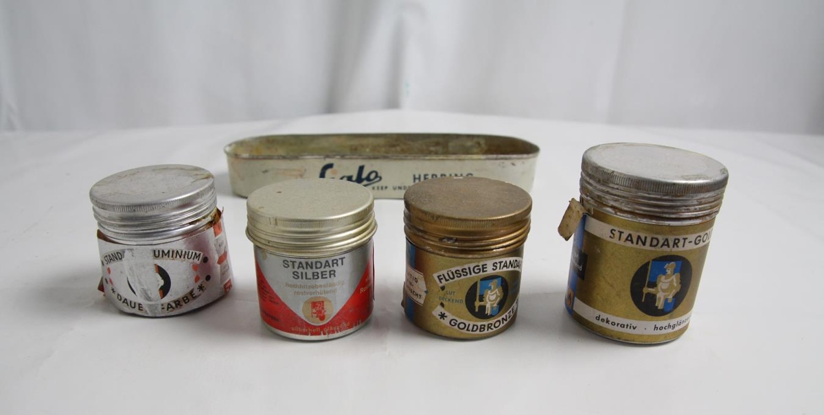 Fjórar málninga dósir í eigu Svavars Guðnasonar listmálara. Bronze, Gold, Goldbronze og Silfur. Málningadósir geymdar í gamlari síldar öskju.