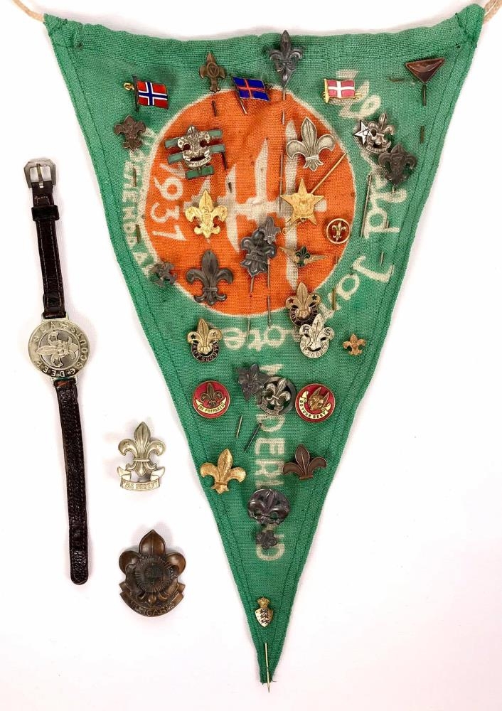 Skátamerki á grænni veifu. Safn af nælum og merkjum frá hinum ýmsu skátamótum og almennu skátastarfi. 30 merki eru föst á fánanum en 4 laus, eitt á leiðuról. Á leðurólsmerkinu stendur :Deep Sea Scouts. Margar skátaliljur og mótsmerki erlendis frá t.d. Noregi, Danmörku, Ungverjalandi og Hollandi. Ymsar áletranir : Be prepared - Do your best - Boy Scouts.