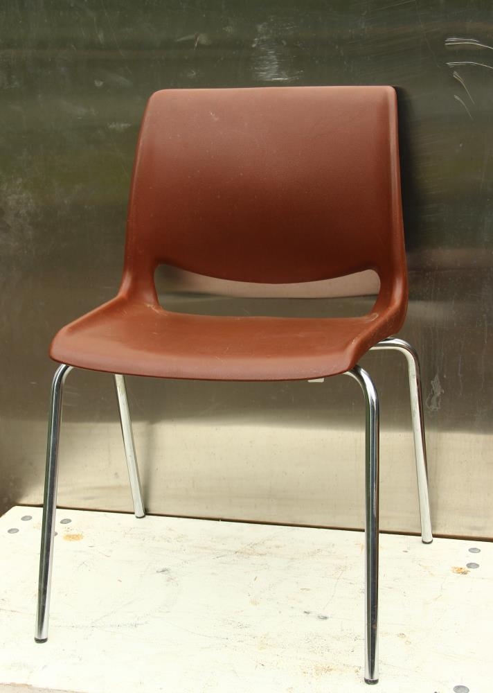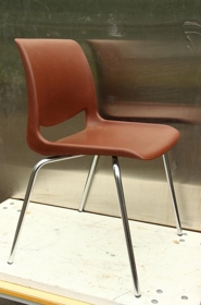 Stóllinn er með stálfótum en seta og bak úr brúnu formsteyptu plasti.