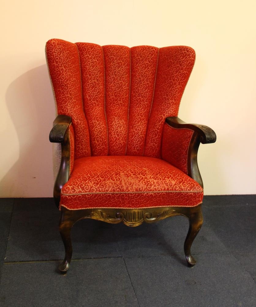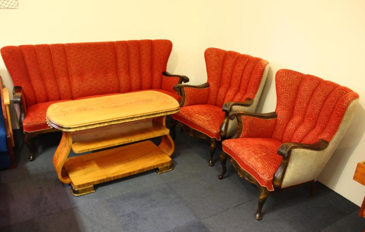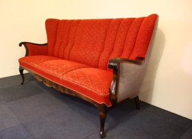 Sófinn er þriggja manna með rauðu áklæði á setu og framanverðu baki, en gráu á hliðum og aftanverðu baki. Grind sófans er úr dökkbrúnum við, útskorin á örmum og að framanverðu. Áklæðið er upprunalegt. Stöku stólarnir tveir eru eins og sófinn.