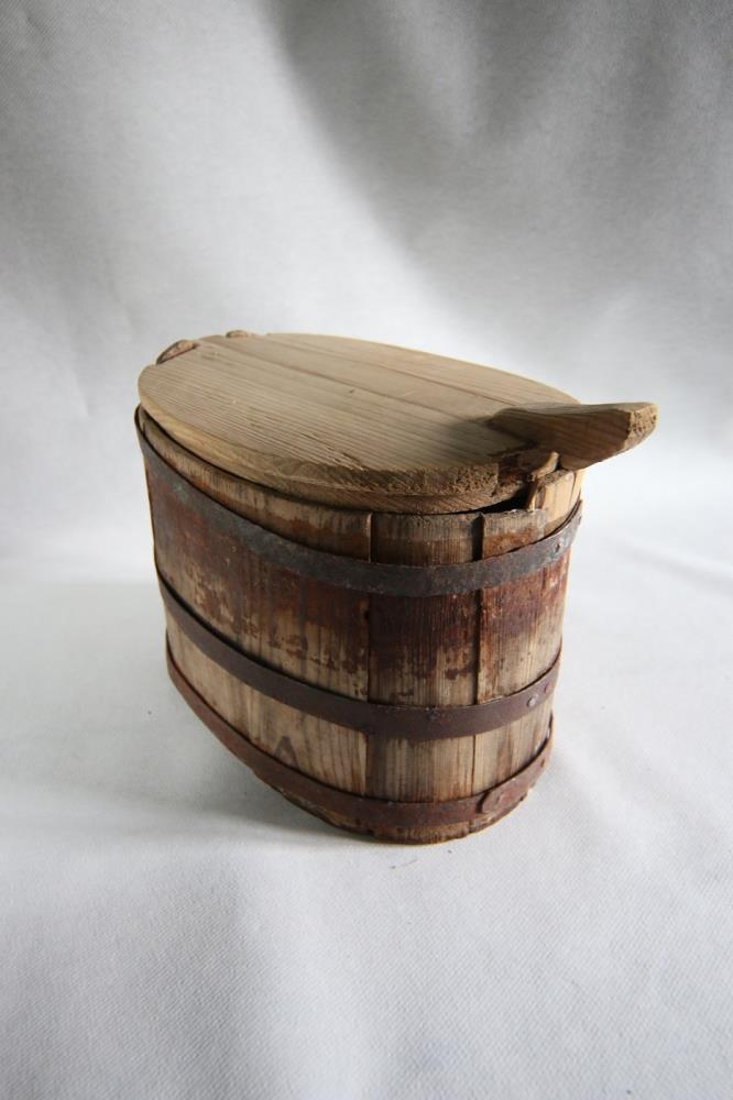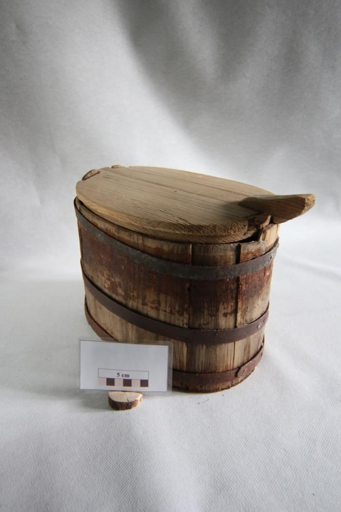 Sporöskjulög tréskrína gyrt þrennum járngjörðum. Notuð undir mat. Úr búi G. Valgerðar Helgadóttur og Sigurjóns Hallgrímssonar, Ytri-Hlíð, Vopnafirði. Guðmundur Þorsteinsson gerði nýtt lok á hana.