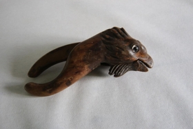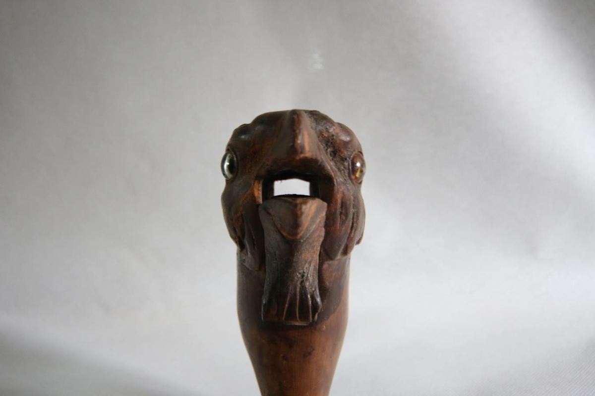 Hnetubrjótur. Útskorinn í líkingu fuglshöfuðs. Augun eru ósamstæð að lit og er ljós steinn í öðru en rafgulur í hinu.