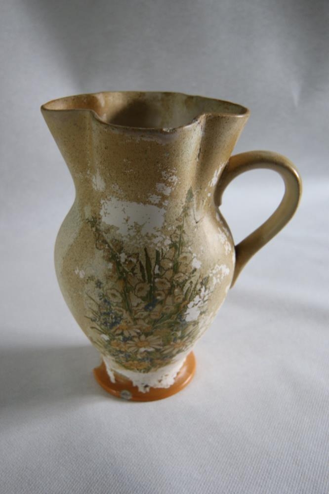 Blómavasi. Úr leir, gulur með ámáluðum blómum, og á honum hald, hugsanlega einnig notaður sem kanna. Í botninn er grafið "Made in England" og grænn ógreinilegur stimpill þar sem stendur "Parkleigh", annað illlæsilegt. Úr búi Jakobs Benediktssonar og Jónínu S. Jónsdóttur, Garði (frá Rauðhólum).