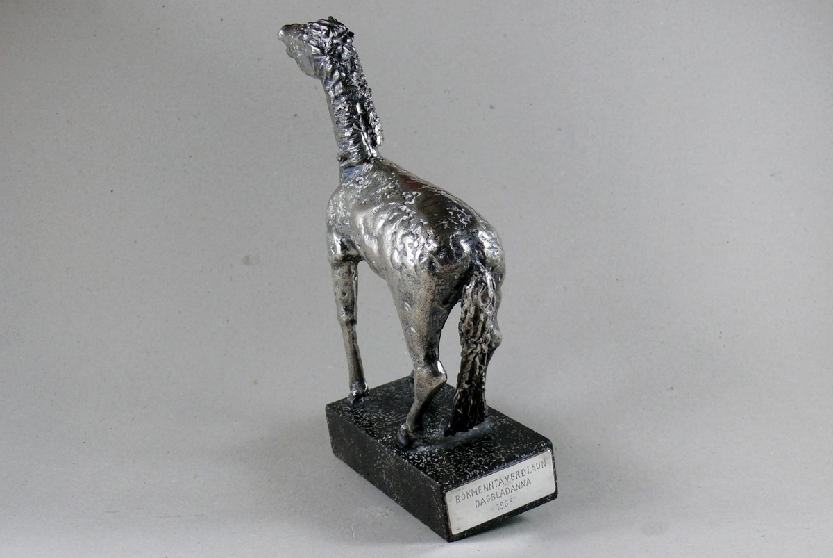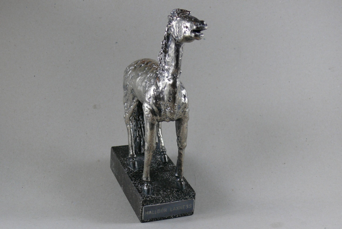 Stytta af hesti á steinstöpli. Merktur: Halldór Laxness. þetta er verðlaunagripur: Bókmenntaverðlaun dagblaðanna.