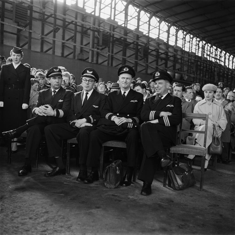 Viscount kemur til Reykjavíkur. Móttaka vélarinnar. Fjöldi fólks situr í flugskýli og hlýðir á ræður. Fremst sitja flugmenn og einni má sjá flugfreyju.