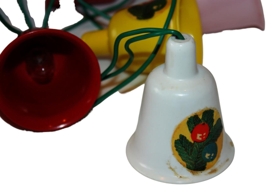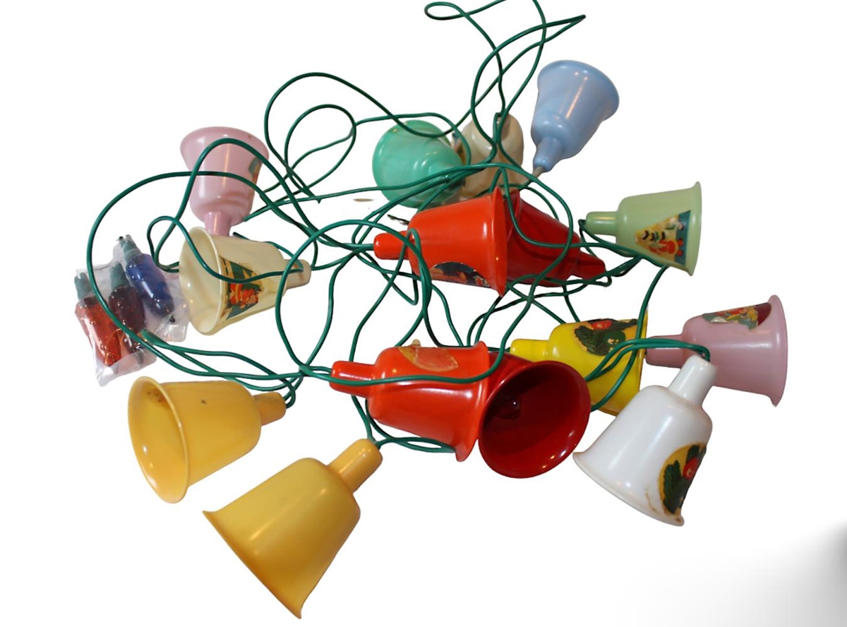 Jólaljós á jólatré. Framleitt að Reykjalundi. Hver pera hefur bjöllulaga skerm og er mismunandi að litum. Á hverri bjöllu er límmiði með jólafígúru.