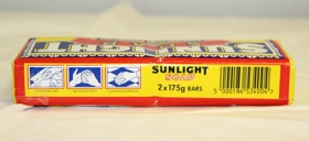 Umbúðirnar um sápuna eru í gulum, rauðum, bláum og hvítum lit. Áletrun: Sunlight soap – Lever(stjarna í R-inu) – 350 g e.
