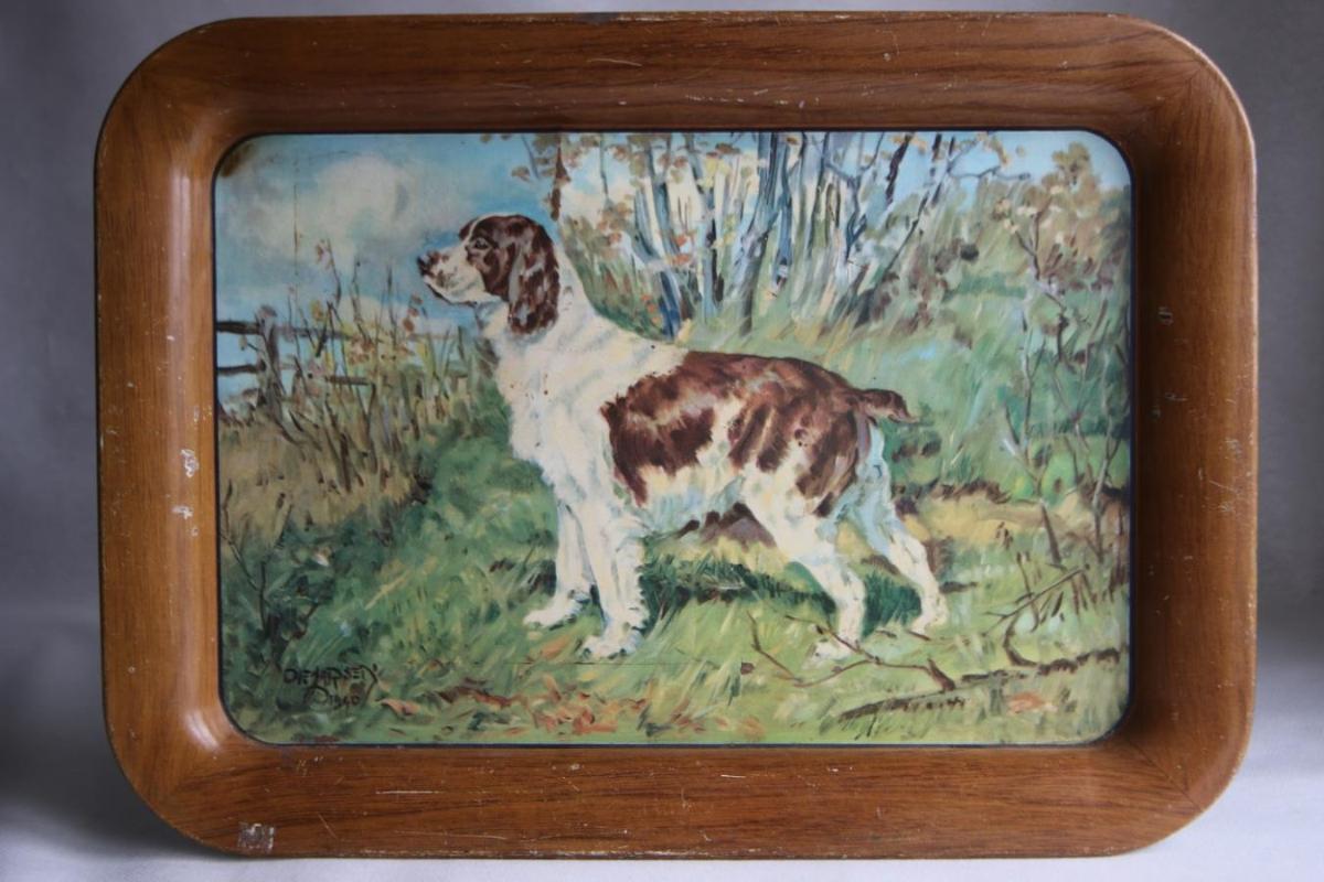 Úr búi Sigurðar Sigfússonar og Sigurlaugar Gunnarsdóttur, Veðramóti. Dóttir þeirra Stefanía gaf Ólöfu Helgadóttur í safnið. Á bakkanum er eftirmynd af málverki af veiðihundi (enskum springer spaniel) eftir bandaríska málarann Ole Larsen, sem sérhæfði sig í að mála dýr, einkum hunda og hesta. Undir nafni hans á myndinni er ártalið 1940.