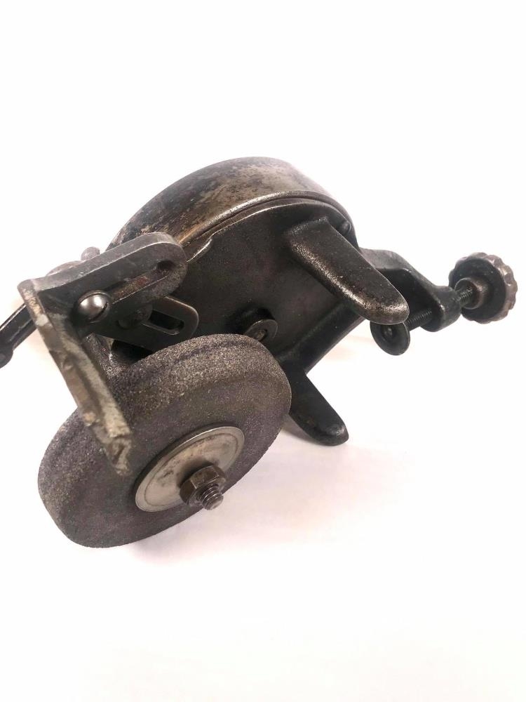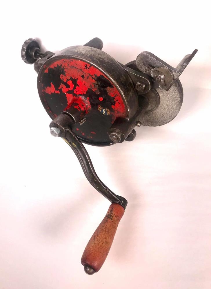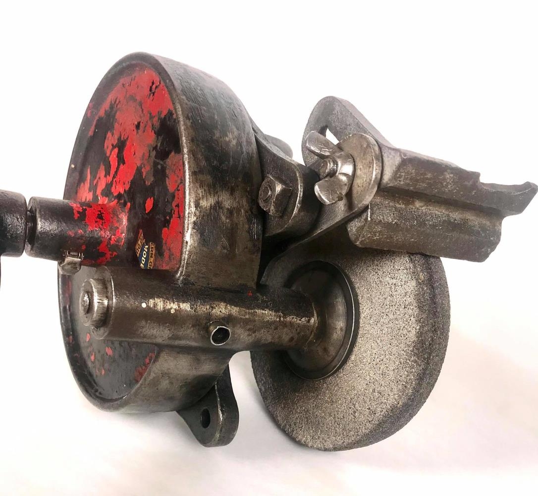 Handsnúið smergel fest á borð úr eigu Gunnars Thorarensen og mjög líklega frá Þórði Thorarensen, gullsmiði - Aðalstræti 13. Gefandi gerði við verkfærið og notaði sem strákur, t.d. til að gera við leikföngin sín.