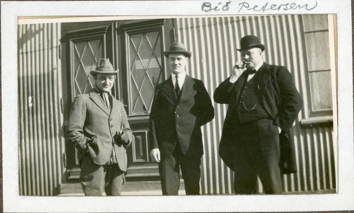 Þrír karlmenn framan við Iðnó, Bíó Peterset yst t.h. Mynd merkt: Bíó Petersen.