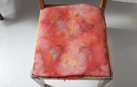 Stóll. Áklæði á setu er útsaumaður rauður ullarjafi. Mjög upplitaður og nokkuð blettóttur. Útsaumurinn er flatsaumur í rauðum, appelsínugulum, brúnum, grænum, fjólubláum og gráum litatónum. Litirnir hafa greinilega tekið breytingum í tímans rás, annað hvort vegna upplitunar eða annarra þátta. Útsaumurinn myndar fjögur blóm og fjögur önnur tákn sem líkjast örvum.