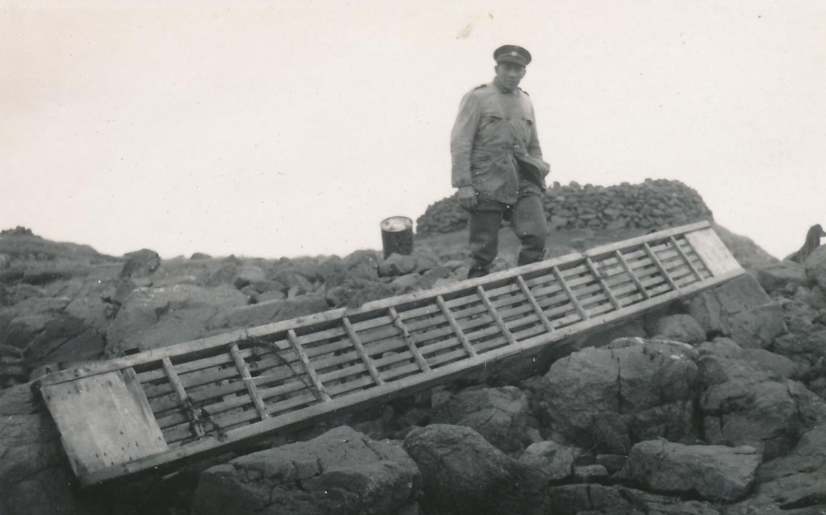 Mynd af óþekktum manni á ströndinni við Straumfjörð eftir sjóslys. Fyrir framan hann er sjógangurinn sem Eugène Gonidec (1907-1998), stýrimaður, hélt sér í, í um 3 klukkustundir, og bjargaði lífi hans eftir skipbrot franska rannsóknarskipsins, Pourquoi-Pas ?. Mögulega er að maðurinn á myndinni sé franski ræðismaðurinn M. Albert Zarzecki, sem mætti á slysstað ásamt Finnboga Rúti, sem tók þessa ljósmynd. Maðurinn er í hermannbúning og ekki er sagt frá öðrum erlendum mönnum á slysstað. 64 árum eftir slysið fannst landgangurinn í Franska sendiráðsbústaðinum í Reykjavík og var sendur til Frakklands við mikla athöfn árið 2000.