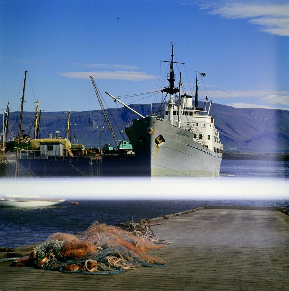 Skip merkt Eimskipafélaginu við bryggju í Reykjavík. Myndin er skemmd.