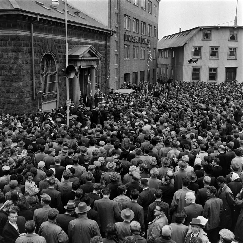 Almennur útifundur um landhelgismálið. Þórarinn Þórarinsson ritstjóri í ræðustól. Það sést í Eggert G. Þorsteinsson á bak við Þórarinn.