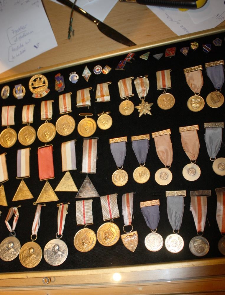 Verðlaunapeningar í sundi frá 1951 til 1963, sem Sigurður Sigurðsson (1939-) frá Akranesi vann í hinum ýmsu sundkeppnum. Einnig eru nokkur barmmerki.