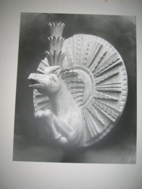 Ljósmynd af lágmynd, á hvítum pappagrunni. Platti með hesti skagandi út úr með kórónu á höfði. Ljósmynd af myndasýningunni sem haldin var í Moskvu árið 1979. Hluti af myndagjöf frá MÍR, sem heldur uppi menningartengslum milli Íslands og Rússlands, ma. með samstarfi við félög og stofnanir, sem sinntu hliðstæðu verkefni í Ráðstjórnarríkjunum, afla heimilda þaðan, útvega kvikmyndir, bækur og tímarit, kynna Íslendingum menningu, vísindi og þjóðfélagshætti sovétþjóðanna, gangast fyrir fræðsluerindum og greiða fyrir ferðalögum þangað. Jafnframt var ætlunin að stuðla að frekari kynnum á íslenskri menningu í Sovétríkjunum.